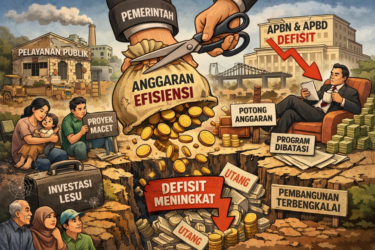Efisiensi dijalankan tanpa perencanaan matang, sekadar mengikuti instruksi tanpa memahami dampaknya. Akibatnya, APBD kehilangan daya dorong, sementara defisit terus menumpuk seperti utang yang tak pernah benar-benar diselesaikan.