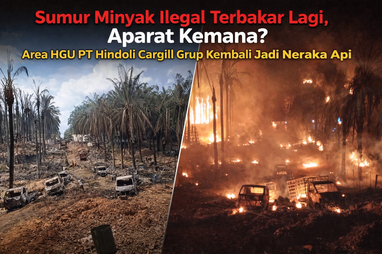 MUSI BANYUASIN,Hunternews.online – Insiden kebakaran hebat kembali melanda sumur minyak ilegal (illegal drilling) di Kobra 1, kawasan HGU PT Hindoli Cargill Group, Desa Tanjung Dalam, Kecamatan Keluang, Kabupaten Musi Banyuasin (Muba), Sumatera Selatan, Selasa (31/3/2026) sekitar pukul 21.00 WIB. Kobaran api yang membumbung tinggi di tengah hamparan perkebunan sawit kembali menjadi alarm keras atas persoalan laten yang tak kunjung terselesaikan di wilayah tersebut.