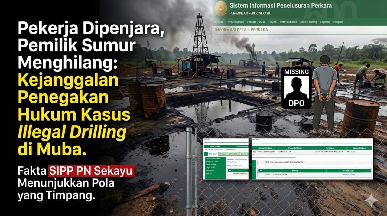 MUSI BANYUASIN,Hunternews.online – Praktik penegakan hukum dalam kasus kerusakan lingkungan akibat aktivitas tambang minyak ilegal (illegal drilling) di Kabupaten Musi Banyuasin (Muba), Sumatera Selatan, menuai sorotan tajam. Sejumlah berkas perkara yang bergulir di Pengadilan Negeri Sekayu memperlihatkan pola yang dinilai timpang, para buruh lapangan dan pekerja kasar diseret ke meja hijau, sementara pihak yang diduga sebagai pemilik sumur dan pengendali modal justru belum tersentuh proses hukum.