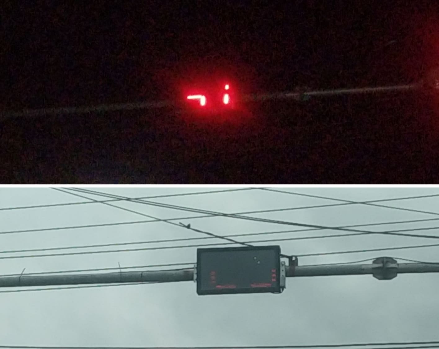– Arah Jerambah JM (Menuju PALI): Kondisi di sisi ini lebih memprihatinkan. Angka penghitung waktu hilang total, hanya menyisakan kerlap-kerlip warna merah putus-putus yang diduga akibat kerusakan modul perangkat.